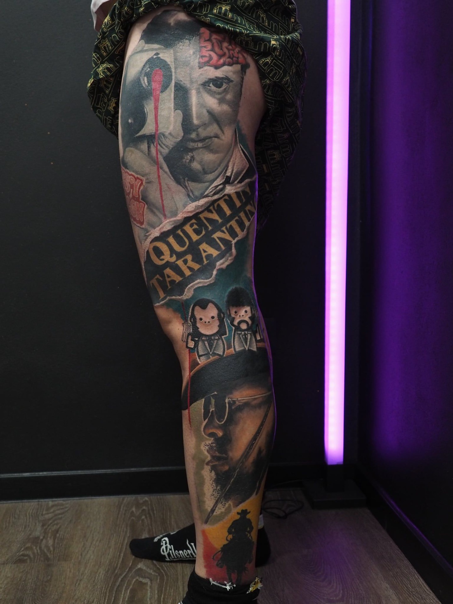Nová část tetování přináší další ikonické postavy a scény z Tarantinova universa. Mezi nimi je bezchybně zachycený Hans Landa z Hanebných panchartů, jeho výraz a detailní ztvárnění přináší na nohu napětí a charakter, zatímco Uma Thurman s katanou jako v Kill Bill dodává dynamiku a sílu.